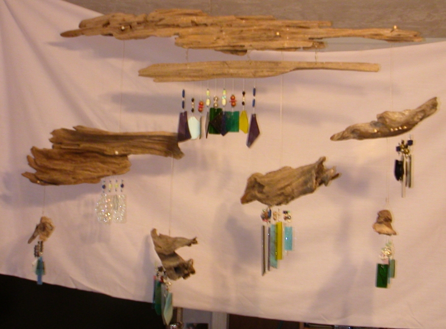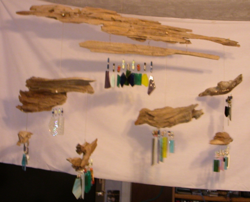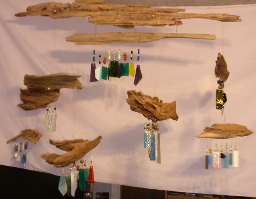 lined and twisted piece. Each of the pieces of wood has its own unique glass arrangement. The pieces